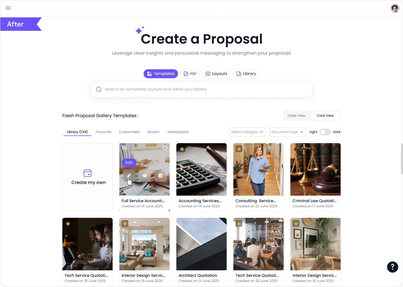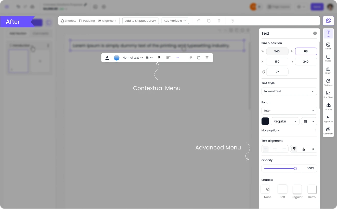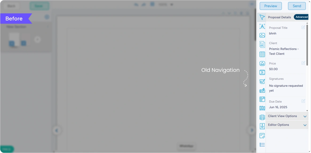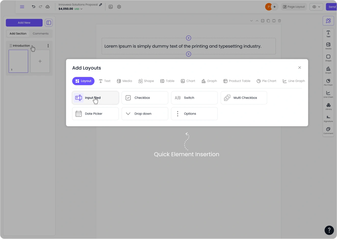 Users can easily expand their document by hovering a section and clicking the inline “+” control to add new elements exactly where they are needed. This reduces unnecessary steps and allows users to build their proposals faster without interrupting their workflow.